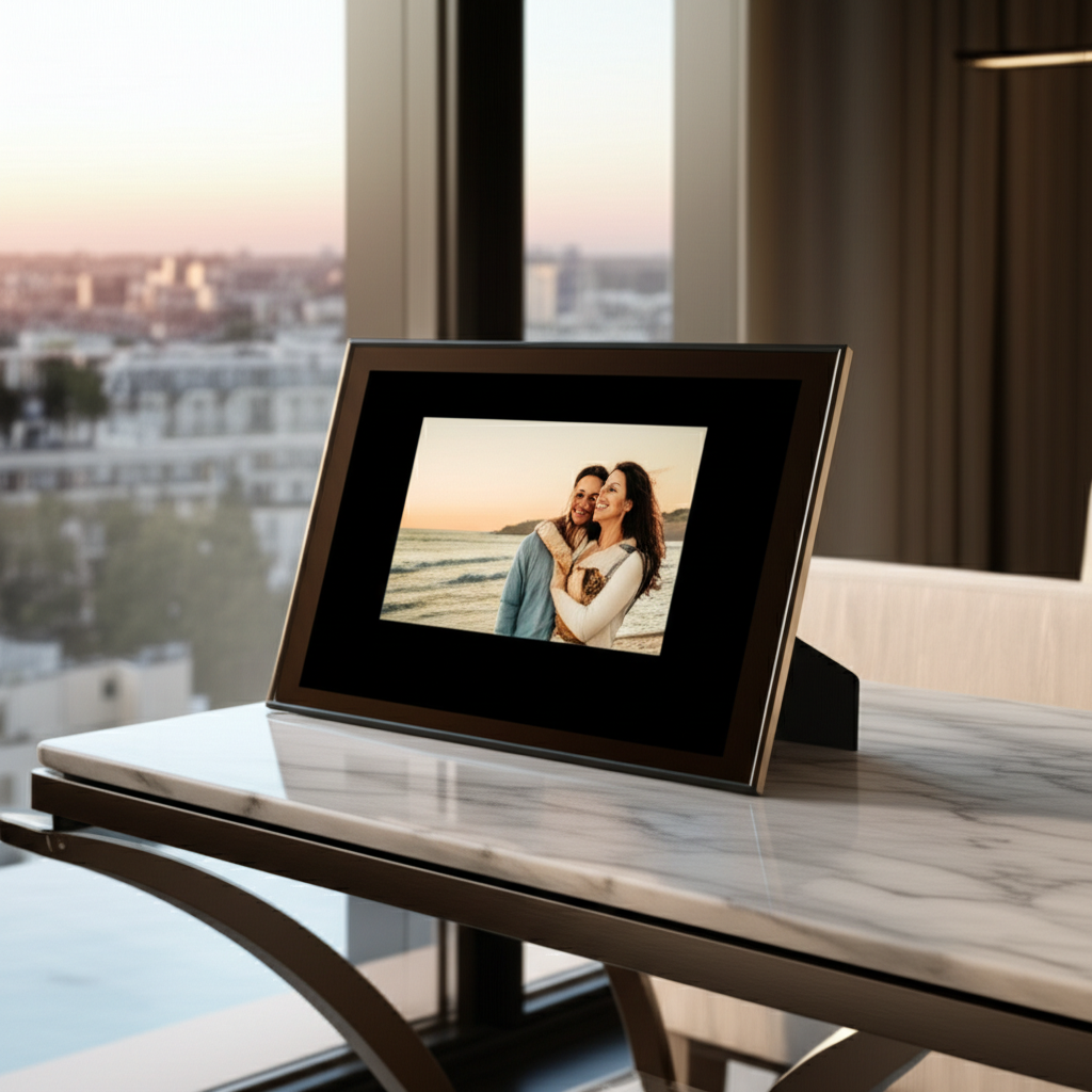 FrothFrame redefines the digital photo frame experience with its elegant design featuring a sleek black bezel and a 16:10 aspect ratio display that perfectly showcases your photos. Share moments effortlessly through SMS, manage your collection with ease, and display your memories in stunning clarity.